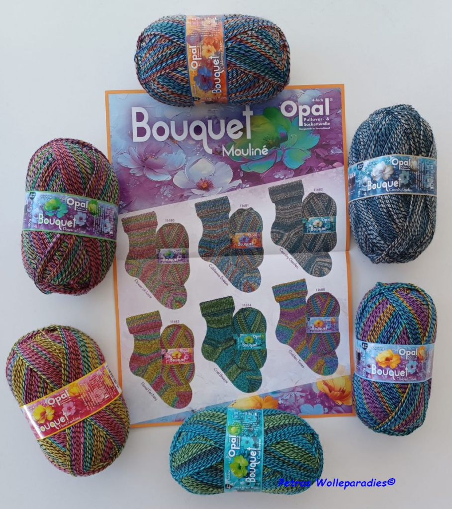 kennt Ihr schon das Sortiment „Bouquet“, 4-fädige Sockenwolle von Opal? Ich finde die Farben richtig toll, weil es einfach mal ein paar andere sind.